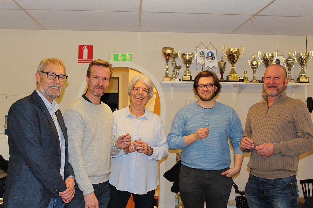 Fyra mottagare av HAIS förtjänstnål i silver för fem år som förtroendevald ledare. Björn Hellberg, Erika Ryden Johansson, Magnus Iven Perborg.Magnus Jansson hämtar Jacobs pris för 200 spelade matcher